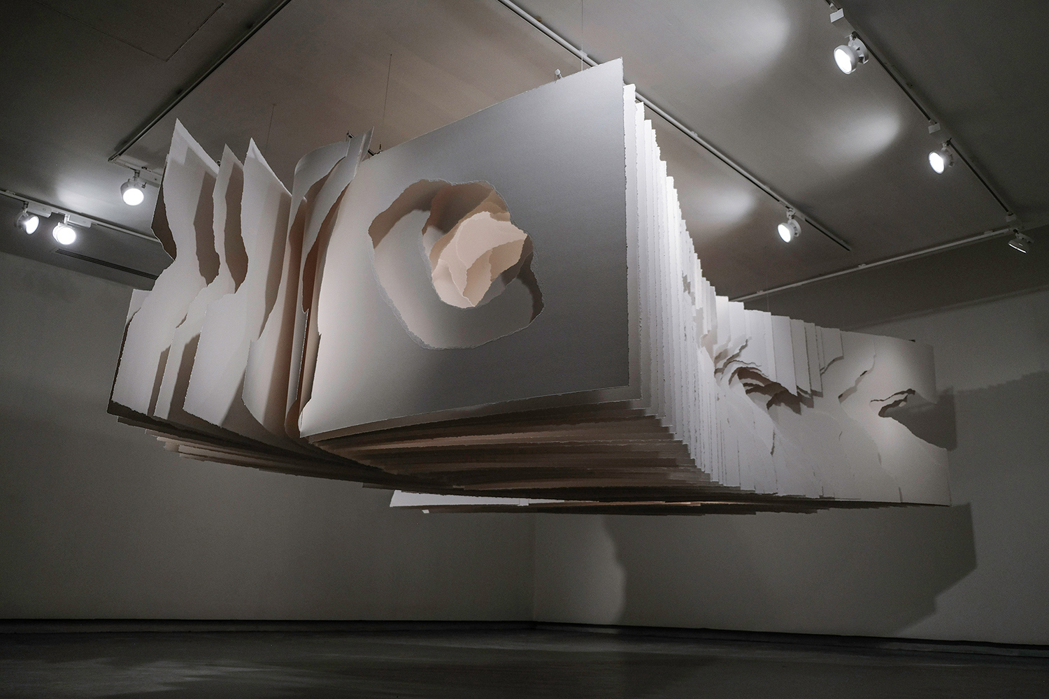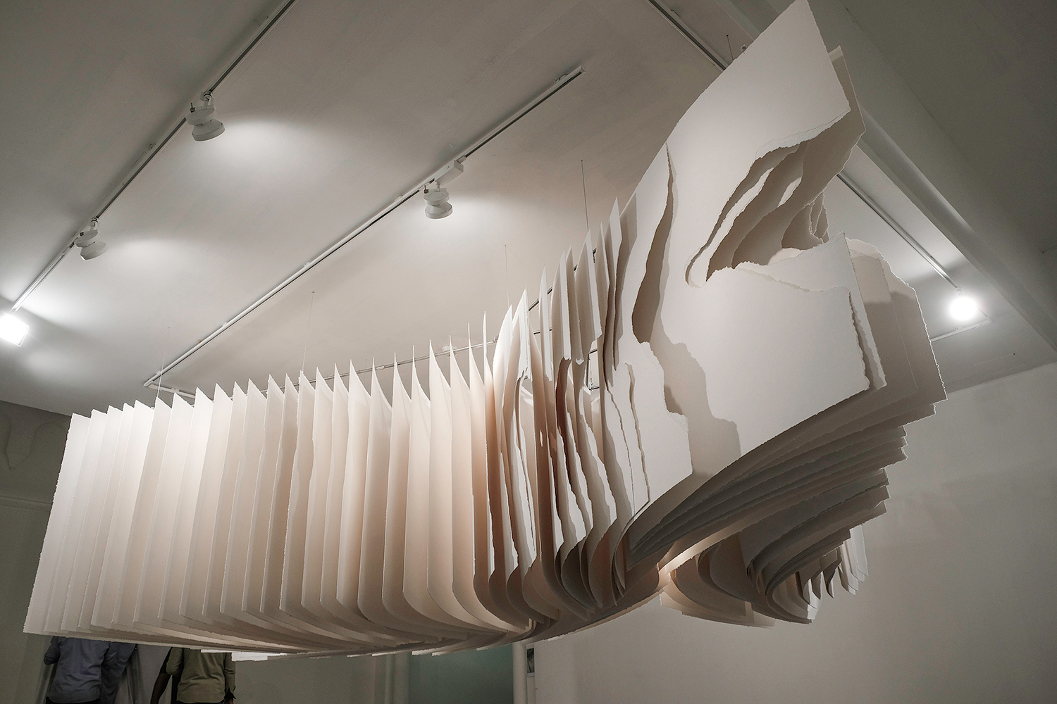 In-situ-Installation, Papier 450g, gerissen, Metallhalterung, 127 x 460 x 480 cm,